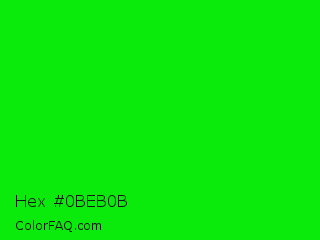 Hex #0beb0b Color is a normal green color and the nearest color is Green #00ff00. Hex code #0beb0b and RGB value is rgb(11,235,11). In RGB color space, this color is composed of 4% red, 92% green, 4% blue, In CMYK color space, this color is composed of 95% cyan, 0% magenta, 95% yellow , 8% black , In HSL color space, this color has a hue angle of 120° , 91% saturation and 48% lightness.