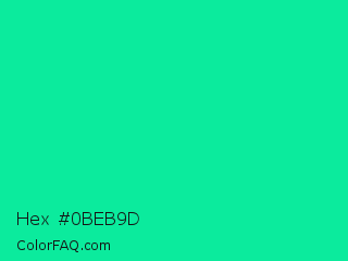 Hex #0beb9d Color is a normal green color and the nearest color is Medium Spring Green #00fa9a. Hex code #0beb9d and RGB value is rgb(11,235,157). In RGB color space, this color is composed of 4% red, 92% green, 62% blue, In CMYK color space, this color is composed of 95% cyan, 0% magenta, 33% yellow , 8% black , In HSL color space, this color has a hue angle of 159° , 91% saturation and 48% lightness.