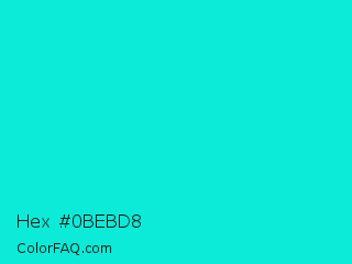 Hex #0bebd8 Color is a normal cyan color and the nearest color is Bright Turquoise #08e8de. Hex code #0bebd8 and RGB value is rgb(11,235,216). In RGB color space, this color is composed of 4% red, 92% green, 85% blue, In CMYK color space, this color is composed of 95% cyan, 0% magenta, 8% yellow , 8% black , In HSL color space, this color has a hue angle of 175° , 91% saturation and 48% lightness.