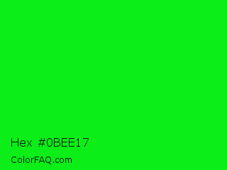 Hex #0bee17 Color is a normal green color and the nearest color is Green #00ff00. Hex code #0bee17 and RGB value is rgb(11,238,23). In RGB color space, this color is composed of 4% red, 93% green, 9% blue, In CMYK color space, this color is composed of 95% cyan, 0% magenta, 90% yellow , 7% black , In HSL color space, this color has a hue angle of 123° , 91% saturation and 49% lightness.