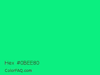 Hex #0bee80 Color is a normal green color and the nearest color is Spring Green #00ff7f. Hex code #0bee80 and RGB value is rgb(11,238,128). In RGB color space, this color is composed of 4% red, 93% green, 50% blue, In CMYK color space, this color is composed of 95% cyan, 0% magenta, 46% yellow , 7% black , In HSL color space, this color has a hue angle of 151° , 91% saturation and 49% lightness.