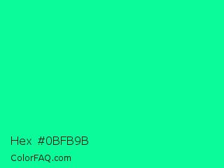 Hex #0bfb9b Color is a normal green color and the nearest color is Medium Spring Green #00fa9a. Hex code #0bfb9b and RGB value is rgb(11,251,155). In RGB color space, this color is composed of 4% red, 98% green, 61% blue, In CMYK color space, this color is composed of 96% cyan, 0% magenta, 38% yellow , 2% black , In HSL color space, this color has a hue angle of 156° , 97% saturation and 51% lightness.