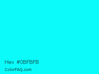 Hex #0bfbfb Color is a normal cyan color and the nearest color is Cyan / Aqua #00ffff. Hex code #0bfbfb and RGB value is rgb(11,251,251). In RGB color space, this color is composed of 4% red, 98% green, 98% blue, In CMYK color space, this color is composed of 96% cyan, 0% magenta, 0% yellow , 2% black , In HSL color space, this color has a hue angle of 180° , 97% saturation and 51% lightness.