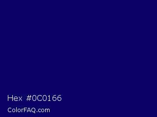 Hex #0c0166 Color is a very dark indigo color and the nearest color is Arapawa #110c6c. Hex code #0c0166 and RGB value is rgb(12,1,102). In RGB color space, this color is composed of 5% red, 0% green, 40% blue, In CMYK color space, this color is composed of 88% cyan, 99% magenta, 0% yellow , 60% black , In HSL color space, this color has a hue angle of 247° , 98% saturation and 20% lightness.