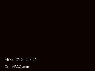 Hex #0c0301 Color is a almost black red color and the nearest color is Diesel #130000. Hex code #0c0301 and RGB value is rgb(12,3,1). In RGB color space, this color is composed of 5% red, 1% green, 0% blue, In CMYK color space, this color is composed of 0% cyan, 75% magenta, 92% yellow , 95% black , In HSL color space, this color has a hue angle of 11° , 85% saturation and 3% lightness.