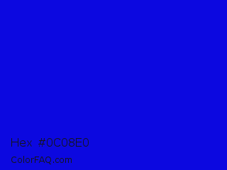 Hex #0c08e0 Color is a normal indigo color and the nearest color is Medium Blue #0000cd. Hex code #0c08e0 and RGB value is rgb(12,8,224). In RGB color space, this color is composed of 5% red, 3% green, 88% blue, In CMYK color space, this color is composed of 95% cyan, 96% magenta, 0% yellow , 12% black , In HSL color space, this color has a hue angle of 241° , 93% saturation and 45% lightness.