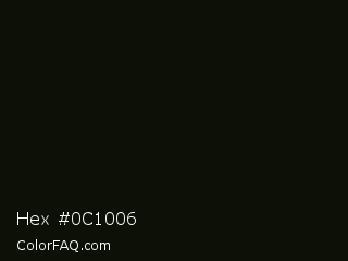 Hex #0c1006 Color is a almost black green color and the nearest color is Gordons Green #0b1107. Hex code #0c1006 and RGB value is rgb(12,16,6). In RGB color space, this color is composed of 5% red, 6% green, 2% blue, In CMYK color space, this color is composed of 25% cyan, 0% magenta, 63% yellow , 94% black , In HSL color space, this color has a hue angle of 84° , 45% saturation and 4% lightness.