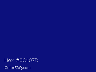 Hex #0c107d Color is a dark blue color and the nearest color is Dark Imperial Blue #00147e. Hex code #0c107d and RGB value is rgb(12,16,125). In RGB color space, this color is composed of 5% red, 6% green, 49% blue, In CMYK color space, this color is composed of 90% cyan, 87% magenta, 0% yellow , 51% black , In HSL color space, this color has a hue angle of 238° , 82% saturation and 27% lightness.