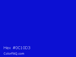 Hex #0c10d3 Color is a normal blue color and the nearest color is Medium Blue #0000cd. Hex code #0c10d3 and RGB value is rgb(12,16,211). In RGB color space, this color is composed of 5% red, 6% green, 83% blue, In CMYK color space, this color is composed of 94% cyan, 92% magenta, 0% yellow , 17% black , In HSL color space, this color has a hue angle of 239° , 89% saturation and 44% lightness.