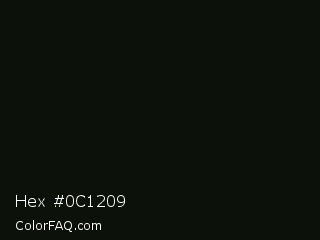 Hex #0c1209 Color is a almost black green color and the nearest color is Gordons Green #0b1107. Hex code #0c1209 and RGB value is rgb(12,18,9). In RGB color space, this color is composed of 5% red, 7% green, 4% blue, In CMYK color space, this color is composed of 33% cyan, 0% magenta, 50% yellow , 93% black , In HSL color space, this color has a hue angle of 100° , 33% saturation and 5% lightness.