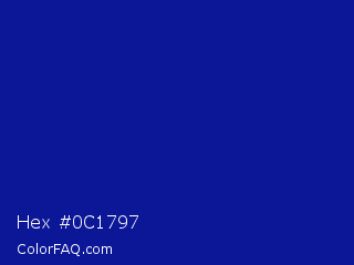 Hex #0c1797 Color is a normal blue color and the nearest color is Indigo Dye #091f92. Hex code #0c1797 and RGB value is rgb(12,23,151). In RGB color space, this color is composed of 5% red, 9% green, 59% blue, In CMYK color space, this color is composed of 92% cyan, 85% magenta, 0% yellow , 41% black , In HSL color space, this color has a hue angle of 235° , 85% saturation and 32% lightness.
