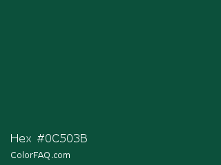 Hex #0c503b Color is a very dark green color and the nearest color is Sacramento State Green #00563f. Hex code #0c503b and RGB value is rgb(12,80,59). In RGB color space, this color is composed of 5% red, 31% green, 23% blue, In CMYK color space, this color is composed of 85% cyan, 0% magenta, 26% yellow , 69% black , In HSL color space, this color has a hue angle of 161° , 74% saturation and 18% lightness.