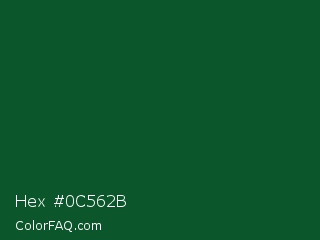 Hex #0c562b Color is a very dark green color and the nearest color is Cal Poly Pomona Green #1e4d2b. Hex code #0c562b and RGB value is rgb(12,86,43). In RGB color space, this color is composed of 5% red, 34% green, 17% blue, In CMYK color space, this color is composed of 86% cyan, 0% magenta, 50% yellow , 66% black , In HSL color space, this color has a hue angle of 145° , 76% saturation and 19% lightness.