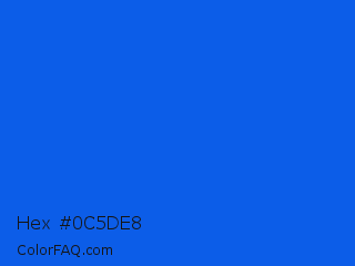 Hex #0c5de8 Color is a normal blue color and the nearest color is Blue Ribbon #0066ff. Hex code #0c5de8 and RGB value is rgb(12,93,232). In RGB color space, this color is composed of 5% red, 36% green, 91% blue, In CMYK color space, this color is composed of 95% cyan, 60% magenta, 0% yellow , 9% black , In HSL color space, this color has a hue angle of 218° , 90% saturation and 48% lightness.