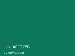 Hex #0c775b Color is a dark cyan color and the nearest color is Deep Green Cyan Turquoise #0e7c61. Hex code #0c775b and RGB value is rgb(12,119,91). In RGB color space, this color is composed of 5% red, 47% green, 36% blue, In CMYK color space, this color is composed of 90% cyan, 0% magenta, 24% yellow , 53% black , In HSL color space, this color has a hue angle of 164° , 82% saturation and 26% lightness.