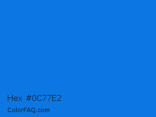 Hex #0c77e2 Color is a normal blue color and the nearest color is Bright Navy Blue #1974d2. Hex code #0c77e2 and RGB value is rgb(12,119,226). In RGB color space, this color is composed of 5% red, 47% green, 89% blue, In CMYK color space, this color is composed of 95% cyan, 47% magenta, 0% yellow , 11% black , In HSL color space, this color has a hue angle of 210° , 90% saturation and 47% lightness.