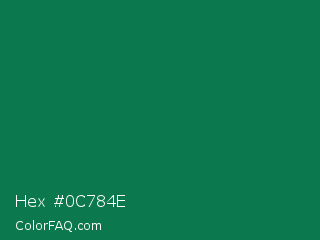 Hex #0c784e Color is a dark green color and the nearest color is Salem #097f4b. Hex code #0c784e and RGB value is rgb(12,120,78). In RGB color space, this color is composed of 5% red, 47% green, 31% blue, In CMYK color space, this color is composed of 90% cyan, 0% magenta, 35% yellow , 53% black , In HSL color space, this color has a hue angle of 157° , 82% saturation and 26% lightness.