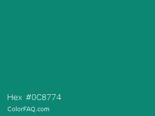 Hex #0c8774 Color is a dark cyan color and the nearest color is Elf Green #088370. Hex code #0c8774 and RGB value is rgb(12,135,116). In RGB color space, this color is composed of 5% red, 53% green, 45% blue, In CMYK color space, this color is composed of 91% cyan, 0% magenta, 14% yellow , 47% black , In HSL color space, this color has a hue angle of 171° , 84% saturation and 29% lightness.