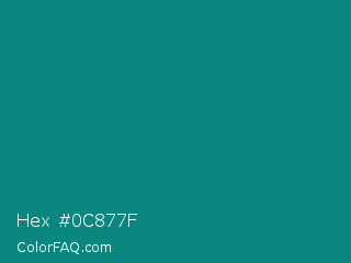 Hex #0c877f Color is a dark cyan color and the nearest color is Teal Green #00827f. Hex code #0c877f and RGB value is rgb(12,135,127). In RGB color space, this color is composed of 5% red, 53% green, 50% blue, In CMYK color space, this color is composed of 91% cyan, 0% magenta, 6% yellow , 47% black , In HSL color space, this color has a hue angle of 176° , 84% saturation and 29% lightness.