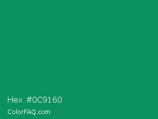 Hex #0c9160 Color is a normal green color and the nearest color is Green Cyan #009966. Hex code #0c9160 and RGB value is rgb(12,145,96). In RGB color space, this color is composed of 5% red, 57% green, 38% blue, In CMYK color space, this color is composed of 92% cyan, 0% magenta, 34% yellow , 43% black , In HSL color space, this color has a hue angle of 158° , 85% saturation and 31% lightness.
