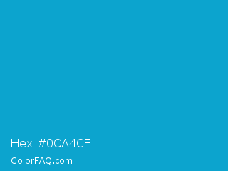 Hex #0ca4ce Color is a normal cyan color and the nearest color is Cerulean #02a4d3. Hex code #0ca4ce and RGB value is rgb(12,164,206). In RGB color space, this color is composed of 5% red, 64% green, 81% blue, In CMYK color space, this color is composed of 94% cyan, 20% magenta, 0% yellow , 19% black , In HSL color space, this color has a hue angle of 193° , 89% saturation and 43% lightness.