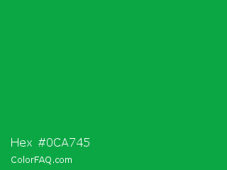 Hex #0ca745 Color is a normal green color and the nearest color is Green Pantone #00ad43. Hex code #0ca745 and RGB value is rgb(12,167,69). In RGB color space, this color is composed of 5% red, 65% green, 27% blue, In CMYK color space, this color is composed of 93% cyan, 0% magenta, 59% yellow , 35% black , In HSL color space, this color has a hue angle of 142° , 87% saturation and 35% lightness.
