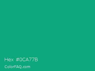 Hex #0ca77b Color is a normal green color and the nearest color is Green Munsell #00a877. Hex code #0ca77b and RGB value is rgb(12,167,123). In RGB color space, this color is composed of 5% red, 65% green, 48% blue, In CMYK color space, this color is composed of 93% cyan, 0% magenta, 26% yellow , 35% black , In HSL color space, this color has a hue angle of 163° , 87% saturation and 35% lightness.
