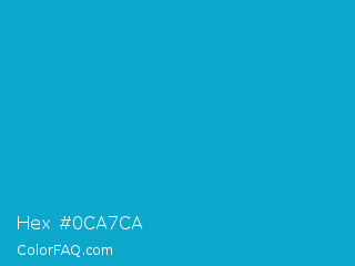 Hex #0ca7ca Color is a normal cyan color and the nearest color is Cerulean #02a4d3. Hex code #0ca7ca and RGB value is rgb(12,167,202). In RGB color space, this color is composed of 5% red, 65% green, 79% blue, In CMYK color space, this color is composed of 94% cyan, 17% magenta, 0% yellow , 21% black , In HSL color space, this color has a hue angle of 191° , 89% saturation and 42% lightness.