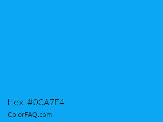 Hex #0ca7f4 Color is a normal blue color and the nearest color is Vivid Cerulean #00aaee. Hex code #0ca7f4 and RGB value is rgb(12,167,244). In RGB color space, this color is composed of 5% red, 65% green, 96% blue, In CMYK color space, this color is composed of 95% cyan, 32% magenta, 0% yellow , 4% black , In HSL color space, this color has a hue angle of 200° , 91% saturation and 50% lightness.