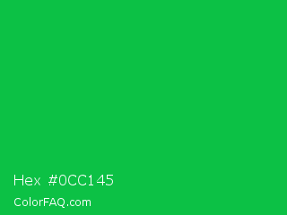 Hex #0cc145 Color is a normal green color and the nearest color is Dark Pastel Green #03c03c. Hex code #0cc145 and RGB value is rgb(12,193,69). In RGB color space, this color is composed of 5% red, 76% green, 27% blue, In CMYK color space, this color is composed of 94% cyan, 0% magenta, 64% yellow , 24% black , In HSL color space, this color has a hue angle of 139° , 88% saturation and 40% lightness.