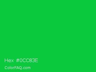 Hex #0cc83e Color is a normal green color and the nearest color is Dark Pastel Green #03c03c. Hex code #0cc83e and RGB value is rgb(12,200,62). In RGB color space, this color is composed of 5% red, 78% green, 24% blue, In CMYK color space, this color is composed of 94% cyan, 0% magenta, 69% yellow , 22% black , In HSL color space, this color has a hue angle of 136° , 89% saturation and 42% lightness.
