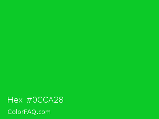 Hex #0cca28 Color is a normal green color and the nearest color is Vivid Malachite #00cc33. Hex code #0cca28 and RGB value is rgb(12,202,40). In RGB color space, this color is composed of 5% red, 79% green, 16% blue, In CMYK color space, this color is composed of 94% cyan, 0% magenta, 80% yellow , 21% black , In HSL color space, this color has a hue angle of 129° , 89% saturation and 42% lightness.