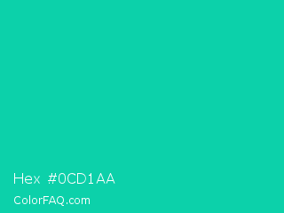 Hex #0cd1aa Color is a normal cyan color and the nearest color is Amazonite #00c4b0. Hex code #0cd1aa and RGB value is rgb(12,209,170). In RGB color space, this color is composed of 5% red, 82% green, 67% blue, In CMYK color space, this color is composed of 94% cyan, 0% magenta, 19% yellow , 18% black , In HSL color space, this color has a hue angle of 168° , 89% saturation and 43% lightness.