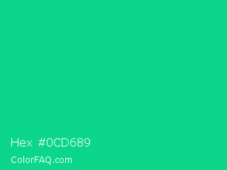 Hex #0cd689 Color is a normal green color and the nearest color is Caribbean Green #00cc99. Hex code #0cd689 and RGB value is rgb(12,214,137). In RGB color space, this color is composed of 5% red, 84% green, 54% blue, In CMYK color space, this color is composed of 94% cyan, 0% magenta, 36% yellow , 16% black , In HSL color space, this color has a hue angle of 157° , 89% saturation and 44% lightness.