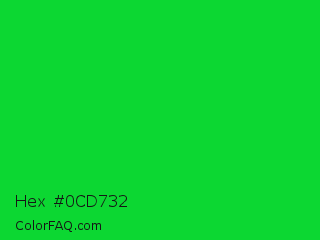 Hex #0cd732 Color is a normal green color and the nearest color is Vivid Malachite #00cc33. Hex code #0cd732 and RGB value is rgb(12,215,50). In RGB color space, this color is composed of 5% red, 84% green, 20% blue, In CMYK color space, this color is composed of 94% cyan, 0% magenta, 77% yellow , 16% black , In HSL color space, this color has a hue angle of 131° , 89% saturation and 45% lightness.