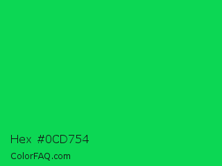 Hex #0cd754 Color is a normal green color and the nearest color is Malachite #0bda51. Hex code #0cd754 and RGB value is rgb(12,215,84). In RGB color space, this color is composed of 5% red, 84% green, 33% blue, In CMYK color space, this color is composed of 94% cyan, 0% magenta, 61% yellow , 16% black , In HSL color space, this color has a hue angle of 141° , 89% saturation and 45% lightness.