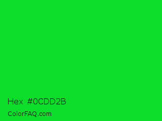 Hex #0cdd2b Color is a normal green color and the nearest color is Vivid Malachite #00cc33. Hex code #0cdd2b and RGB value is rgb(12,221,43). In RGB color space, this color is composed of 5% red, 87% green, 17% blue, In CMYK color space, this color is composed of 95% cyan, 0% magenta, 81% yellow , 13% black , In HSL color space, this color has a hue angle of 129° , 90% saturation and 46% lightness.