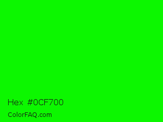 Hex #0cf700 Color is a normal green color and the nearest color is Green #00ff00. Hex code #0cf700 and RGB value is rgb(12,247,0). In RGB color space, this color is composed of 5% red, 97% green, 0% blue, In CMYK color space, this color is composed of 95% cyan, 0% magenta, 100% yellow , 3% black , In HSL color space, this color has a hue angle of 117° , 100% saturation and 48% lightness.
