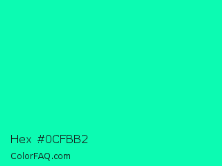 Hex #0cfbb2 Color is a normal green color and the nearest color is Medium Spring Green #00fa9a. Hex code #0cfbb2 and RGB value is rgb(12,251,178). In RGB color space, this color is composed of 5% red, 98% green, 70% blue, In CMYK color space, this color is composed of 95% cyan, 0% magenta, 29% yellow , 2% black , In HSL color space, this color has a hue angle of 162° , 97% saturation and 52% lightness.