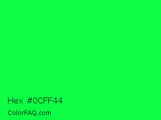 Hex #0cff44 Color is a normal green color and the nearest color is Malachite #0bda51. Hex code #0cff44 and RGB value is rgb(12,255,68). In RGB color space, this color is composed of 5% red, 100% green, 27% blue, In CMYK color space, this color is composed of 95% cyan, 0% magenta, 73% yellow , 0% black , In HSL color space, this color has a hue angle of 134° , 100% saturation and 52% lightness.