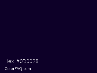 Hex #0d0028 Color is a almost black indigo color and the nearest color is Black Rock #0d0332. Hex code #0d0028 and RGB value is rgb(13,0,40). In RGB color space, this color is composed of 5% red, 0% green, 16% blue, In CMYK color space, this color is composed of 68% cyan, 100% magenta, 0% yellow , 84% black , In HSL color space, this color has a hue angle of 260° , 100% saturation and 8% lightness.