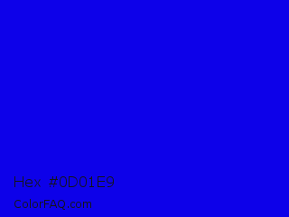 Hex #0d01e9 Color is a normal indigo color and the nearest color is Blue #0000ff. Hex code #0d01e9 and RGB value is rgb(13,1,233). In RGB color space, this color is composed of 5% red, 0% green, 91% blue, In CMYK color space, this color is composed of 94% cyan, 100% magenta, 0% yellow , 9% black , In HSL color space, this color has a hue angle of 243° , 99% saturation and 46% lightness.