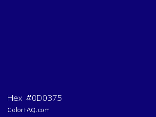 Hex #0d0375 Color is a dark indigo color and the nearest color is Arapawa #110c6c. Hex code #0d0375 and RGB value is rgb(13,3,117). In RGB color space, this color is composed of 5% red, 1% green, 46% blue, In CMYK color space, this color is composed of 89% cyan, 97% magenta, 0% yellow , 54% black , In HSL color space, this color has a hue angle of 245° , 95% saturation and 24% lightness.