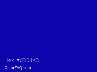 Hex #0d04ad Color is a normal indigo color and the nearest color is Zaffre #0014a8. Hex code #0d04ad and RGB value is rgb(13,4,173). In RGB color space, this color is composed of 5% red, 2% green, 68% blue, In CMYK color space, this color is composed of 92% cyan, 98% magenta, 0% yellow , 32% black , In HSL color space, this color has a hue angle of 243° , 95% saturation and 35% lightness.