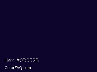 Hex #0d052b Color is a almost black indigo color and the nearest color is Black Rock #0d0332. Hex code #0d052b and RGB value is rgb(13,5,43). In RGB color space, this color is composed of 5% red, 2% green, 17% blue, In CMYK color space, this color is composed of 70% cyan, 88% magenta, 0% yellow , 83% black , In HSL color space, this color has a hue angle of 253° , 79% saturation and 9% lightness.
