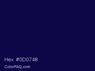 Hex #0d0748 Color is a very dark indigo color and the nearest color is Deep Cove #051040. Hex code #0d0748 and RGB value is rgb(13,7,72). In RGB color space, this color is composed of 5% red, 3% green, 28% blue, In CMYK color space, this color is composed of 82% cyan, 90% magenta, 0% yellow , 72% black , In HSL color space, this color has a hue angle of 246° , 82% saturation and 15% lightness.