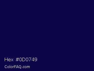 Hex #0d0749 Color is a very dark indigo color and the nearest color is Deep Cove #051040. Hex code #0d0749 and RGB value is rgb(13,7,73). In RGB color space, this color is composed of 5% red, 3% green, 29% blue, In CMYK color space, this color is composed of 82% cyan, 90% magenta, 0% yellow , 71% black , In HSL color space, this color has a hue angle of 245° , 83% saturation and 16% lightness.