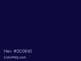 Hex #0d0840 Color is a very dark indigo color and the nearest color is Deep Cove #051040. Hex code #0d0840 and RGB value is rgb(13,8,64). In RGB color space, this color is composed of 5% red, 3% green, 25% blue, In CMYK color space, this color is composed of 80% cyan, 88% magenta, 0% yellow , 75% black , In HSL color space, this color has a hue angle of 245° , 78% saturation and 14% lightness.
