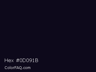 Hex #0d091b Color is a almost black indigo color and the nearest color is Deep Ebony #0c0b1d. Hex code #0d091b and RGB value is rgb(13,9,27). In RGB color space, this color is composed of 5% red, 4% green, 11% blue, In CMYK color space, this color is composed of 52% cyan, 67% magenta, 0% yellow , 89% black , In HSL color space, this color has a hue angle of 253° , 50% saturation and 7% lightness.
