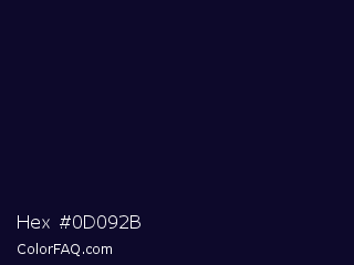 Hex #0d092b Color is a very dark indigo color and the nearest color is Black Rock #0d0332. Hex code #0d092b and RGB value is rgb(13,9,43). In RGB color space, this color is composed of 5% red, 4% green, 17% blue, In CMYK color space, this color is composed of 70% cyan, 79% magenta, 0% yellow , 83% black , In HSL color space, this color has a hue angle of 247° , 65% saturation and 10% lightness.